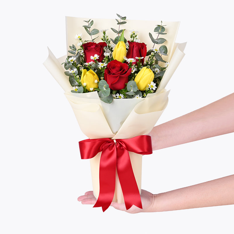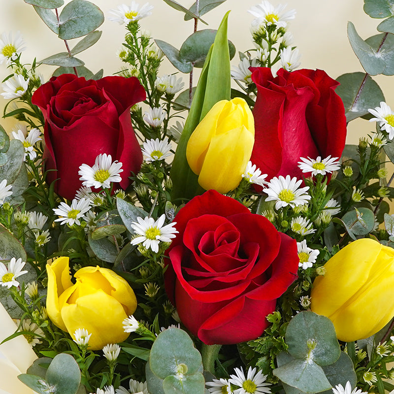 Yellow Tulips (3 Stalks), Red Roses (3 Stalks), Eucalyptus Leaves, Aster, Papua/Tea Leaf.