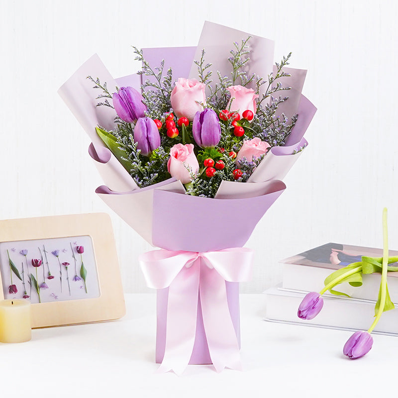 Gentle caresses of pastel pink, orange & purple hues, medleyed together to bring you our whimsical Astraea flower bouquet. Featuring a miscellany of roses, tulips & berries - this arrangement makes the perfect pick for the most magical celebrations that life sends your way.