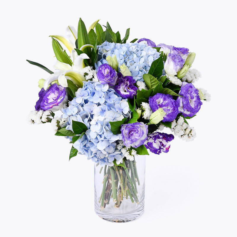 White Lily (1 Stalk), Light Blue Hydrangea (2 Stalks), Purple Eustoma (4 Stalks), White Statice