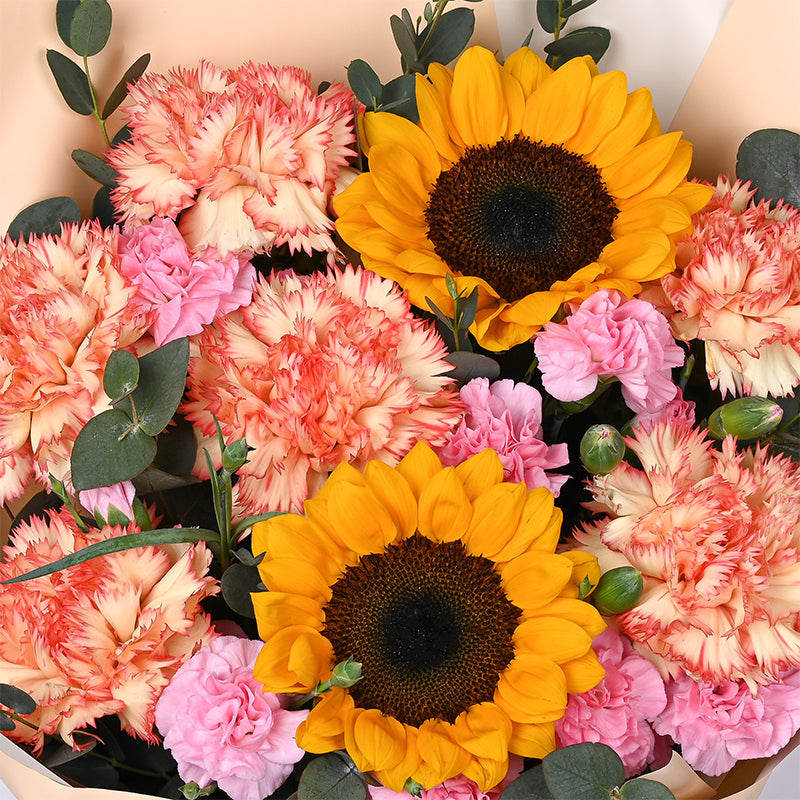 Yellow Sunflower (2 Stalks), Light Pink Carnation Spray (3 Stalks), Yellow Orange Carnation (6 Stalks), Eucalyptus Leaves