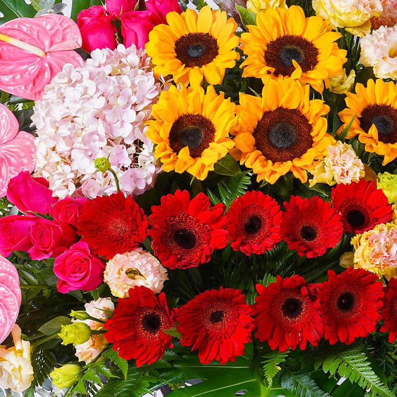 Pink Anthurium (3 stalks), Orange Bird of Paradise (5 stalks), Champagne Eustoma (5 stalks), Red Gerbera (10 stalks), Pink Hydrangea (1 stalk), Green Ivy, Green Monstera, Green Cordyline, Eucalyptus Leaves