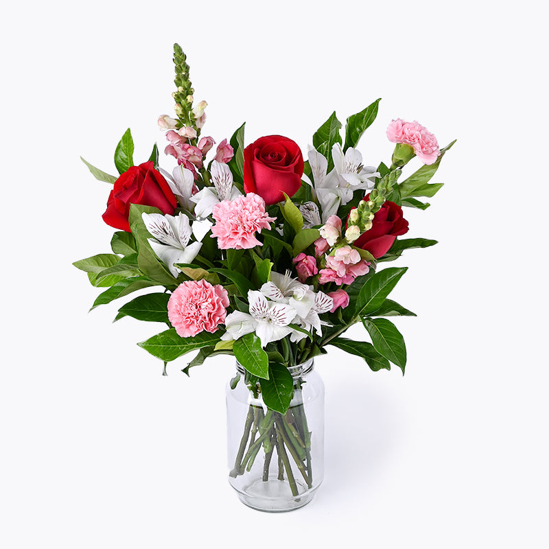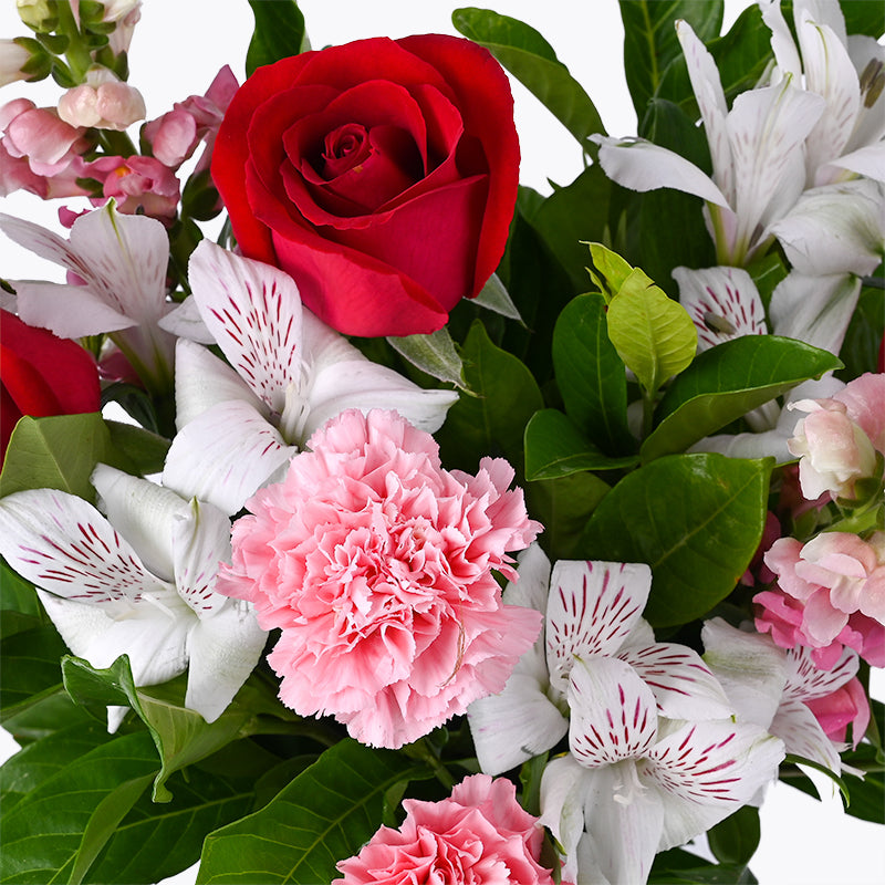 White Alstromeria (3 Stalks), Light Pink Carnation (3 Stalks), Red Rose (3 Stalks), Snap Dragon (2 Stalks)