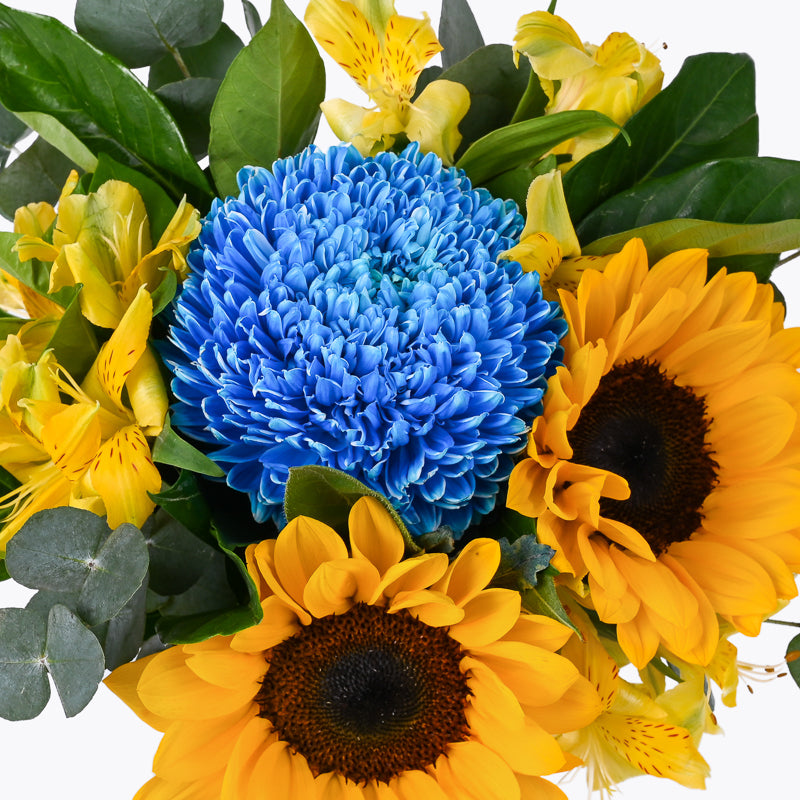 Yellow Sunflower (2 Stalks), Yellow Alstroemeria (3 Stalks), Blue Mum Net (1 Stalk), Eucalyptus Leaves