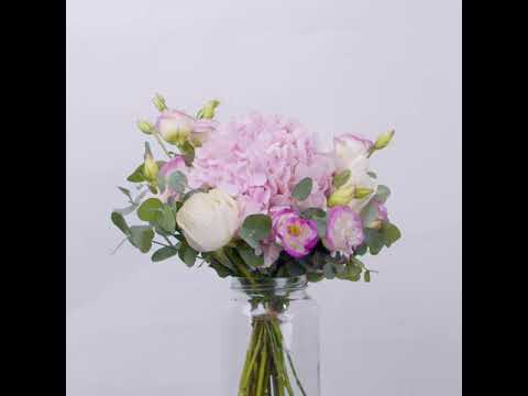Pink Eustoma (2 stalks), Pink Hydrangea (1 stalk), White Rose (3 stalks), Eucalyptus Leaves