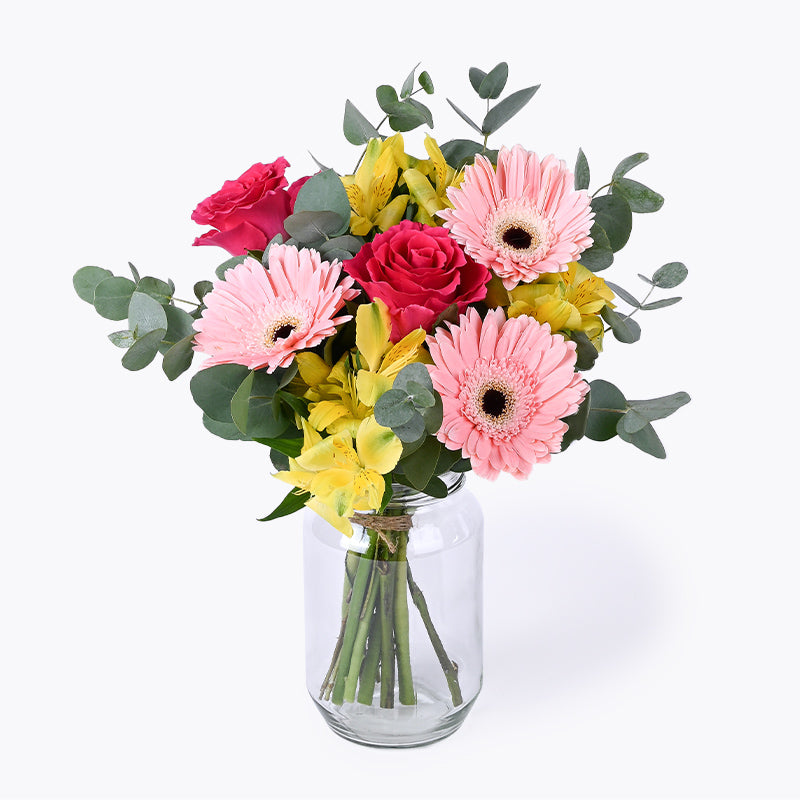 Looking for a small gesture that'll impress as well? Our Caprera arrangement is your answer! With eye-catching hues of vivid red, joyful pink and energetic yellow, it'll bring sunshine to any room thanks to its gorgeous palette.