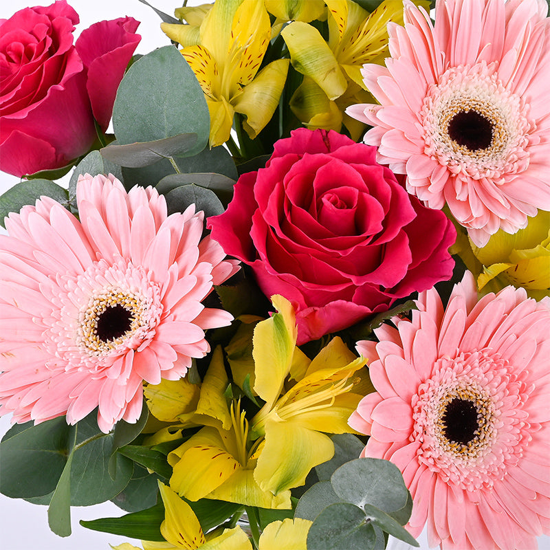Yellow Alstroemeria (3 Stalks), Pink Gerbera (3 Stalks), Shocking Rose (2 Stalks), Eucalyptus Leaves