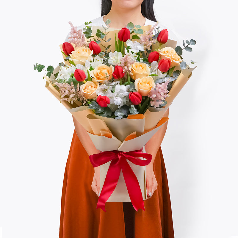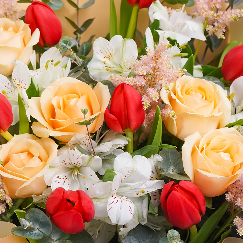 Red Tulips (10 stalks), Astilbe Pink (5 stalks), White Alstroemeria (5 stalks), Champagne Rose (6 stalks), Eucalyptus Cinerea