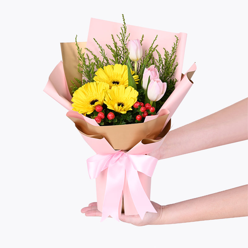 Soft whispers of pink, medleyed together with bursts of bright yellow. Our ethereal Cornelia bouquet brings you a mélange of premium tulips, sunshiny gerberas & red berries - perfect for making that special someone's day.