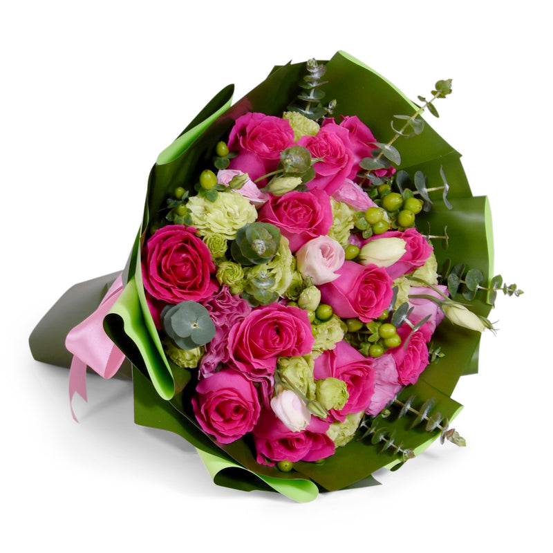 Pink Eustomas (2 Stalks), Green Eustomas (3 Stalks), Shocking Pink Roses (12 Stalks), Green Berry (3 Stalks), Eucalyptus Leaves