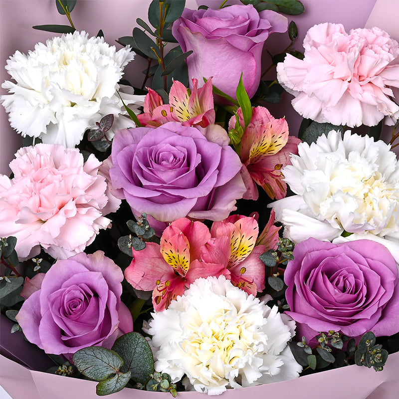 White Carnation (3 Stalks), Pink Carnation (2 Stalks), Purple Roses (4 Stalks), Pink Alstroemeria (2 Stalks), Eucalyptus Leaves