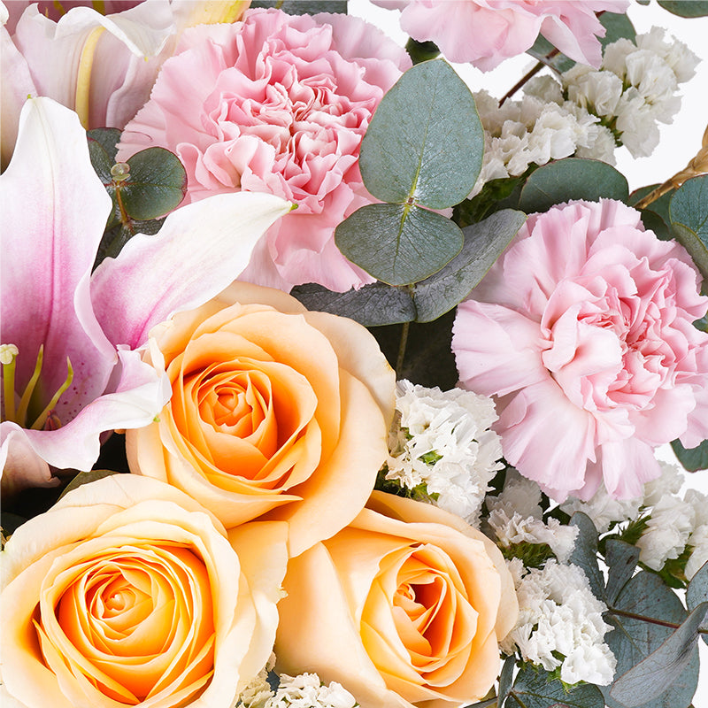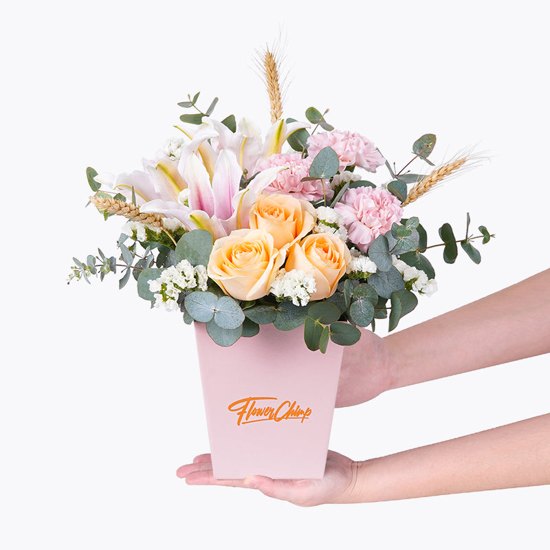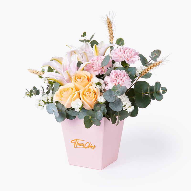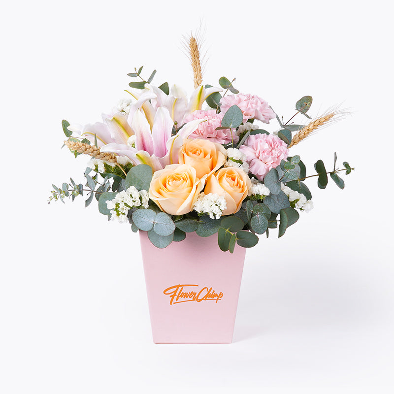 Pink Carnation (3 Stalks), Champagne Roses (3 Stalks), Pink Lily (1 Stalk), White Statice (2 Stalks), Eucalyptus Leaves, Dried Wheat Natural