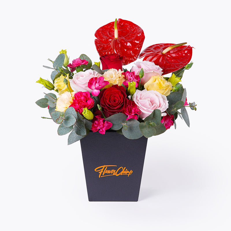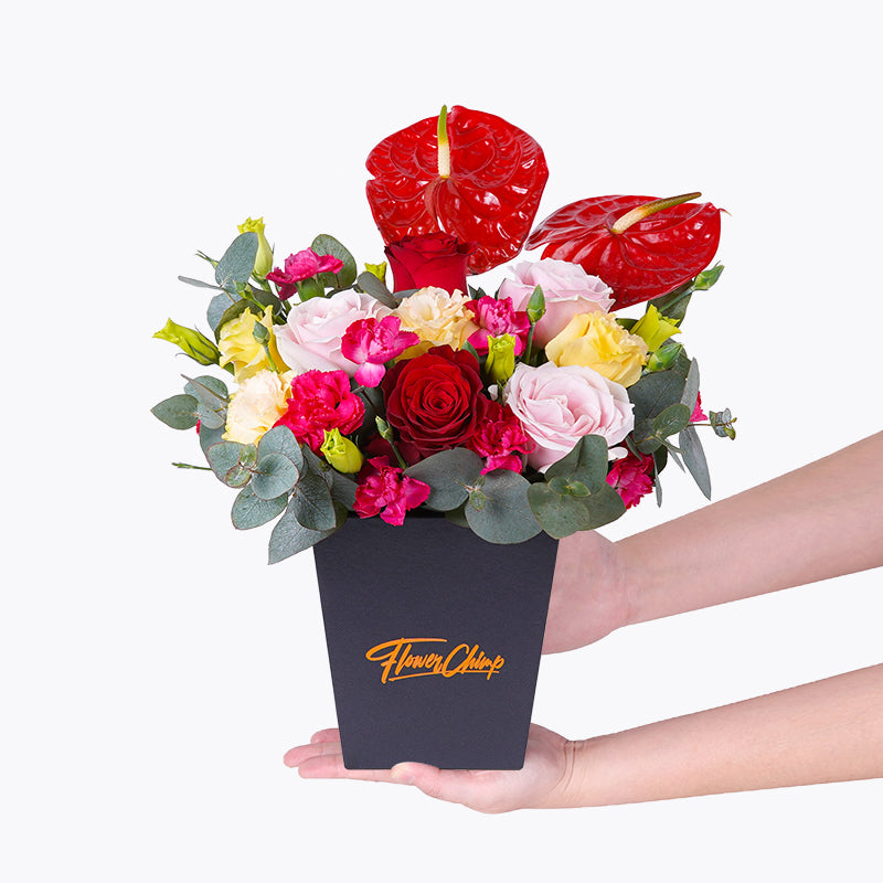 Red Roses (2 Stalks), Pink Roses (3 Stalks), Red Anthurium (2 Stalks), Pink Carnation Spray (1 Stalk), Champagne Eustoma (1 Stalk), Eucalyptus Leaves