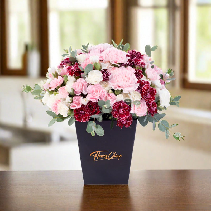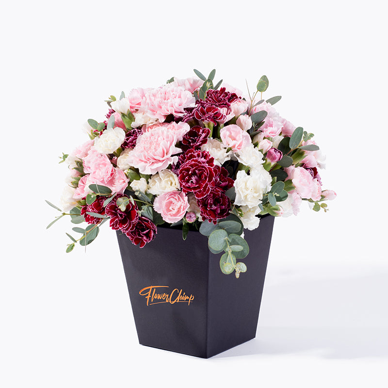Light Pink Carnation (5 Stalks), Maroon Carnation (5 Stalks), White Carnation Spray (5 Stalks), Light Pink Carnation Spray (5 Stalks), Eucalyptus Leaves