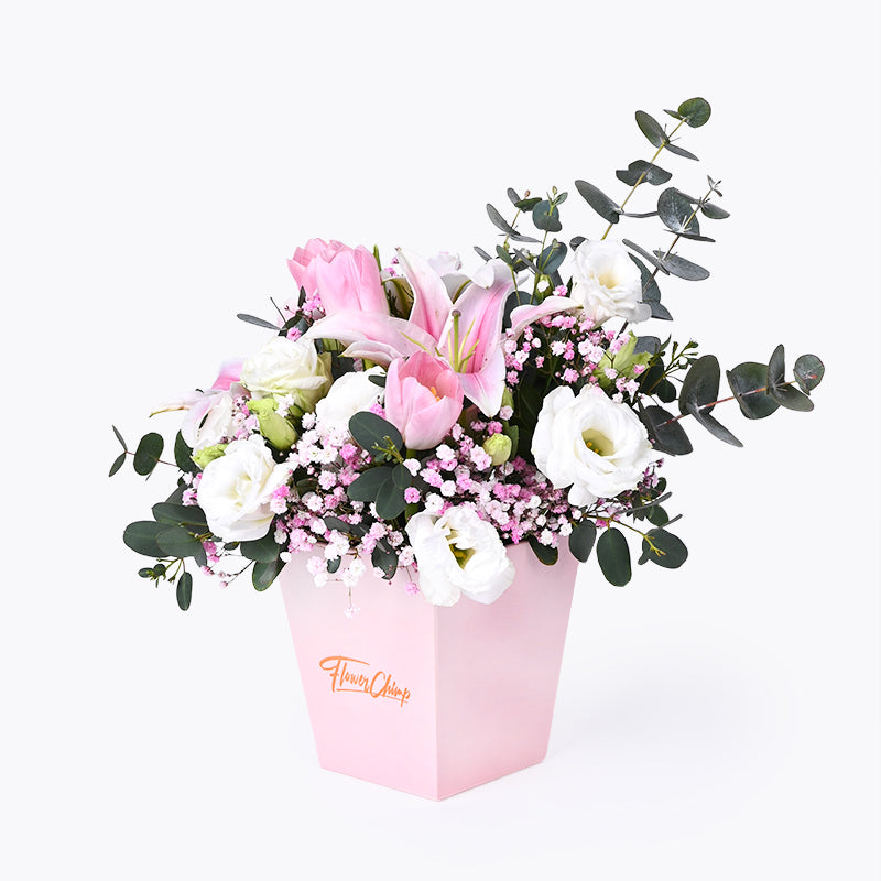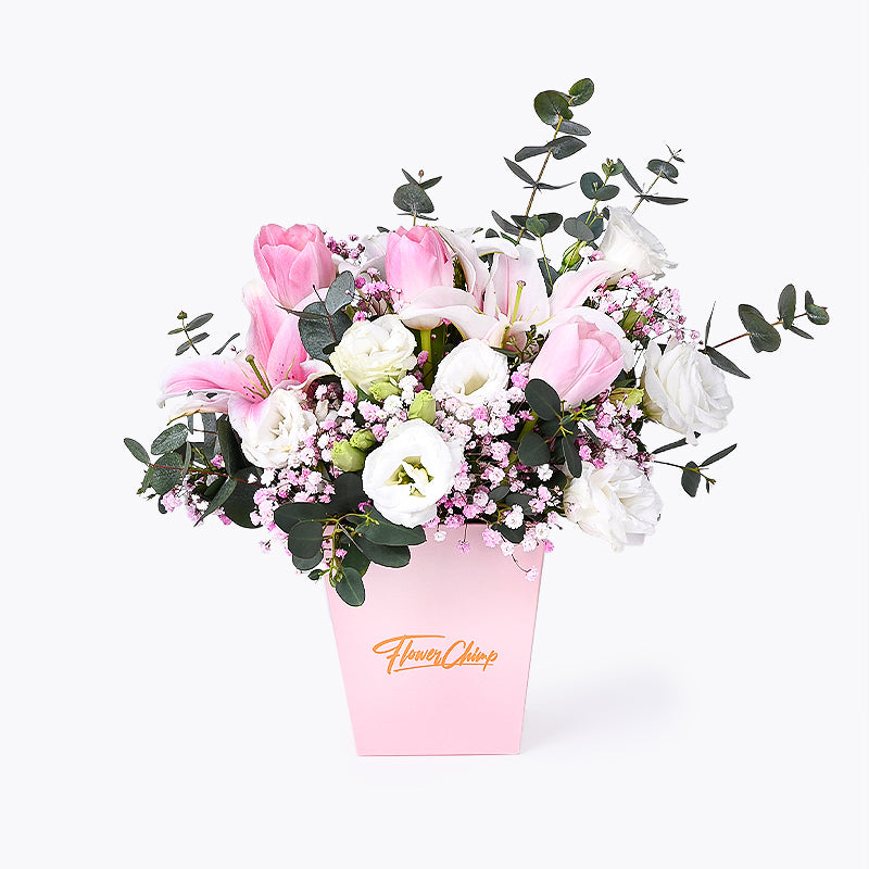 Light Pink Tulip (3 Stalks), Pink Lily (1 Stalk), White Eustoma (2 Stalks), Eucalyptus Leaves, White Baby Breath