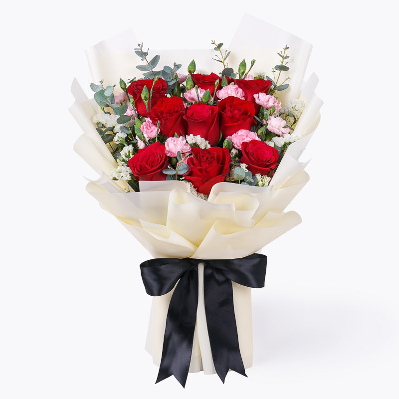 Red Roses (9 Stalks), Light Pink Carnation Spray (3 Stalks), White Statice (2 stalks), Eucalyptus Leaves