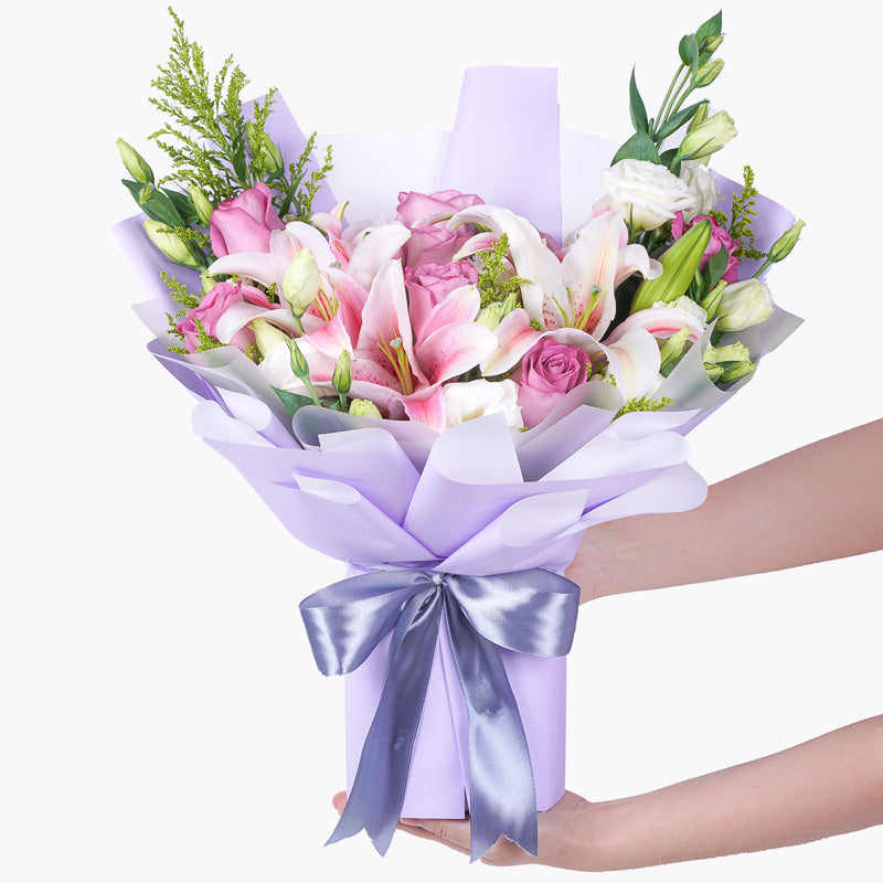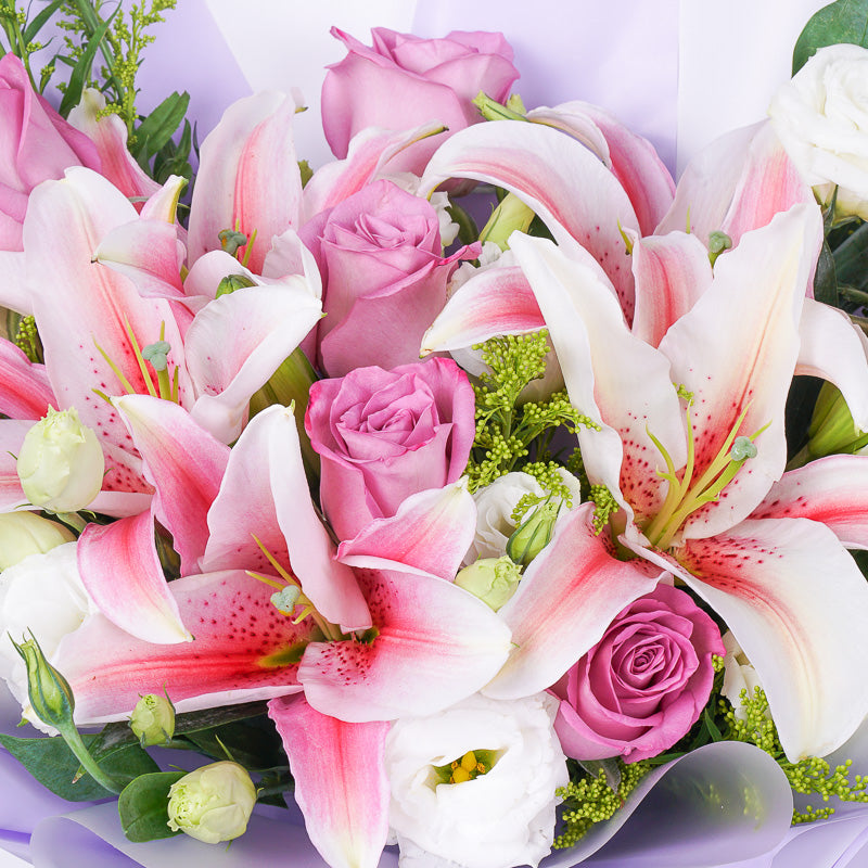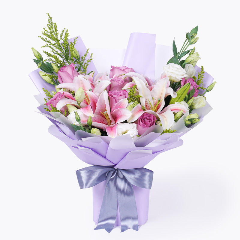 Treat mom like the queen she is this Mother's Day with our Royale flower bouquet. An exquisite arrangement of pink lilies, white eustomas and purple roses - this stunning flower arrangement is a royal treat, made specially to celebrate mom on a very special day.