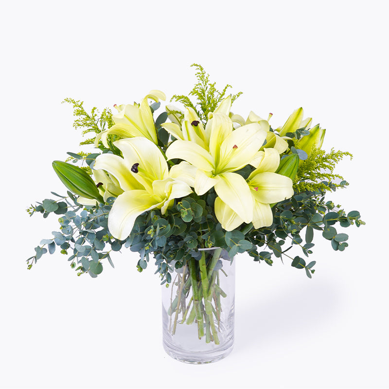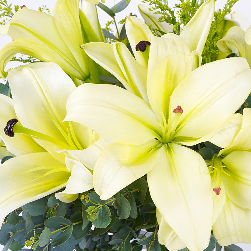 Yellow Lily (5 Stalks), Yellow Peacock, Eucalyptus Leaves