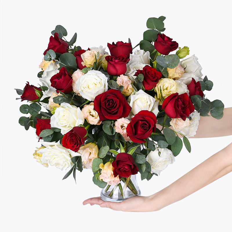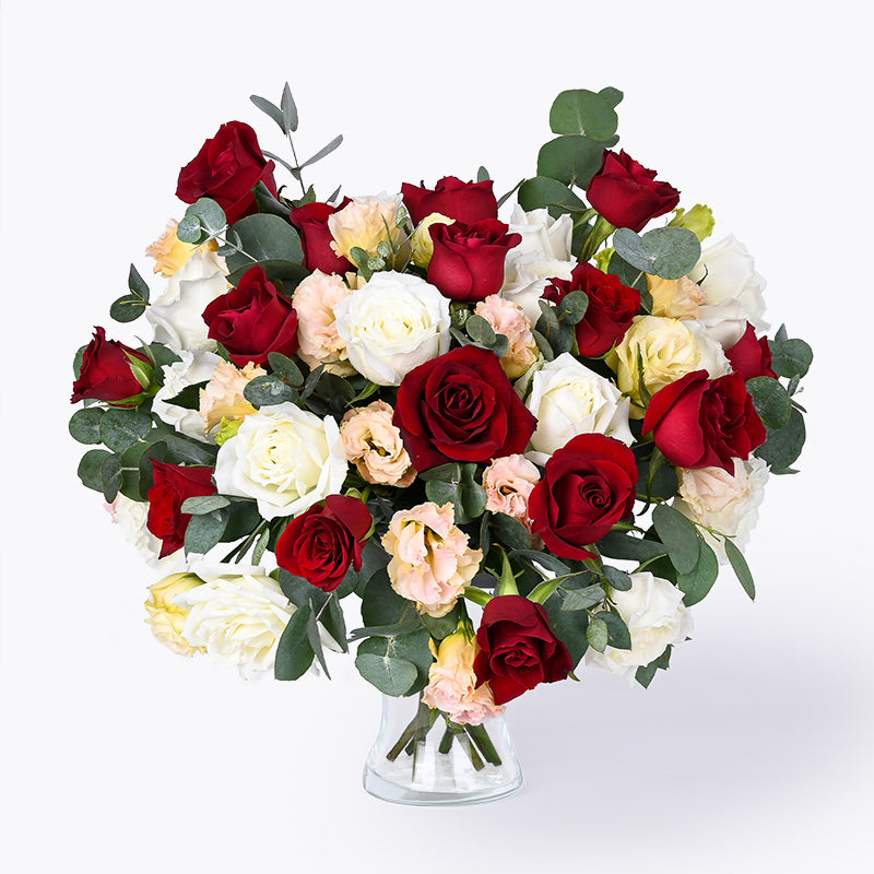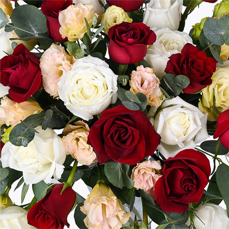 Champagne Eustoma (3 Stalks), Red Rose (15 Stalks), White Rose (15 Stalks), Eucalyptus Leaves