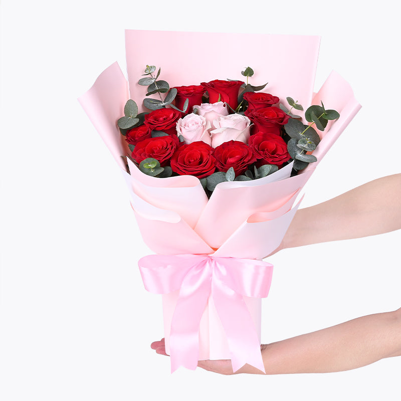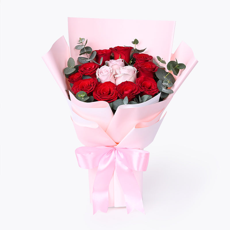 Light Pink Rose (3 Stalks), Red Rose (10 Stalks), Eucalyptus Leaves