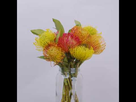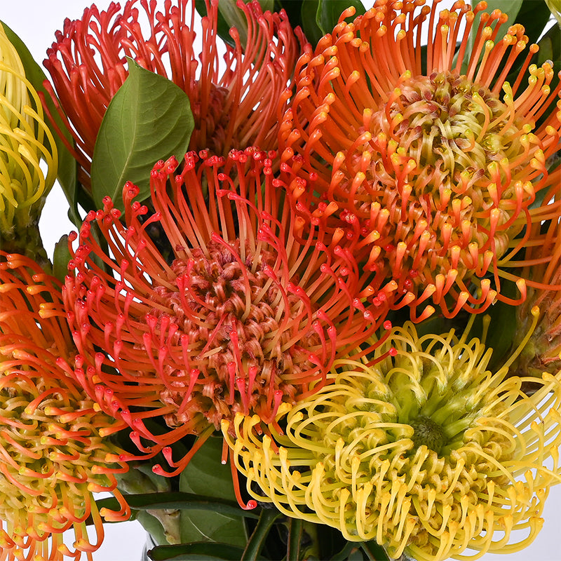 Red Pincushion (2 stalks), Yellow Pincushion (3 stalks), Orange Pincushion (3 stalks)