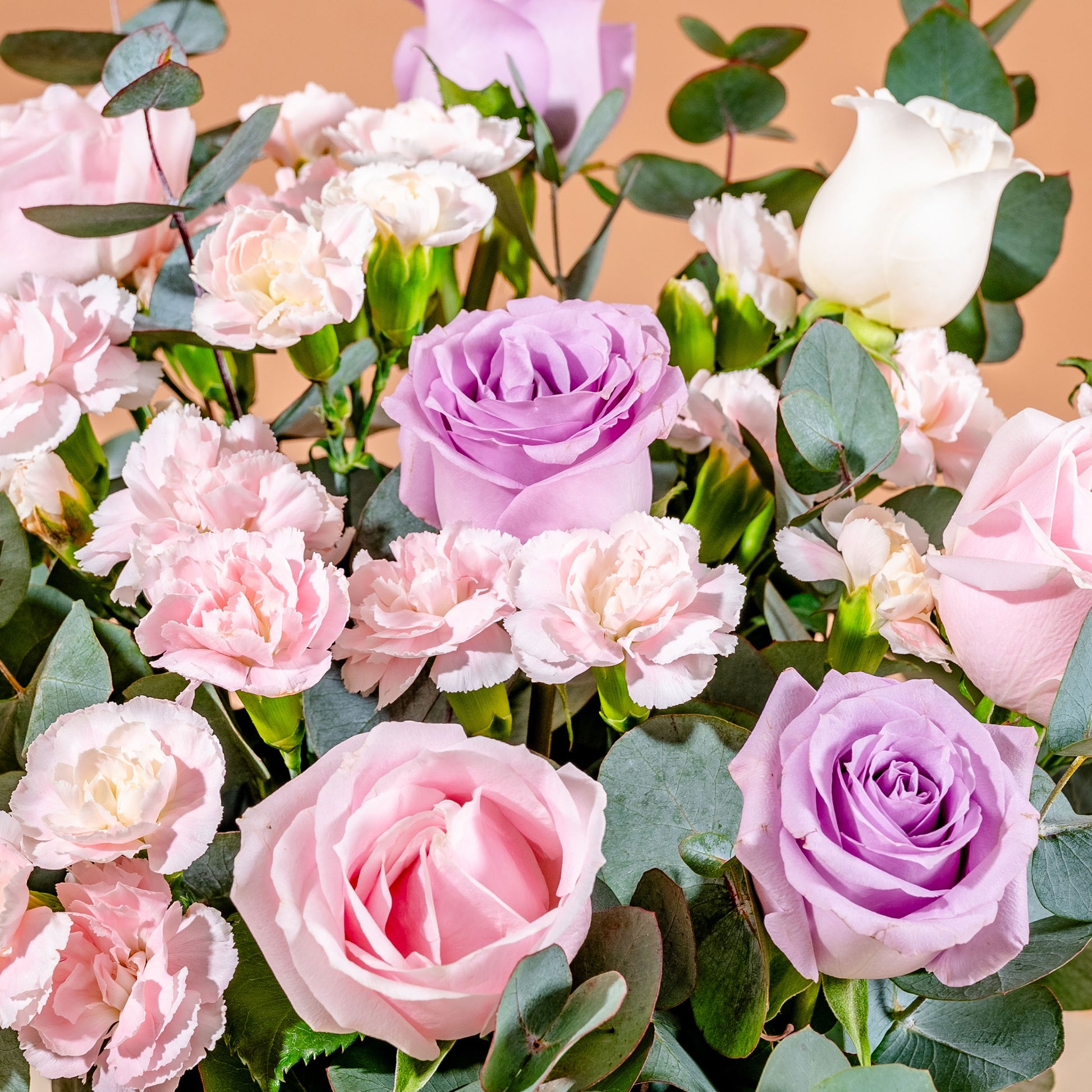 A bouquet white, pink and purple roses accompanied by light pink carnations and baby blue eucalyptus. A pastel themed bouquet that represents your love and friendship. Perfect to express your appreciation any day!