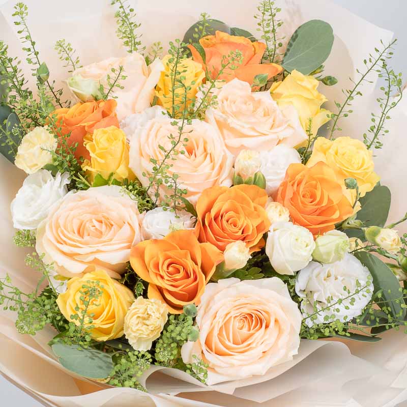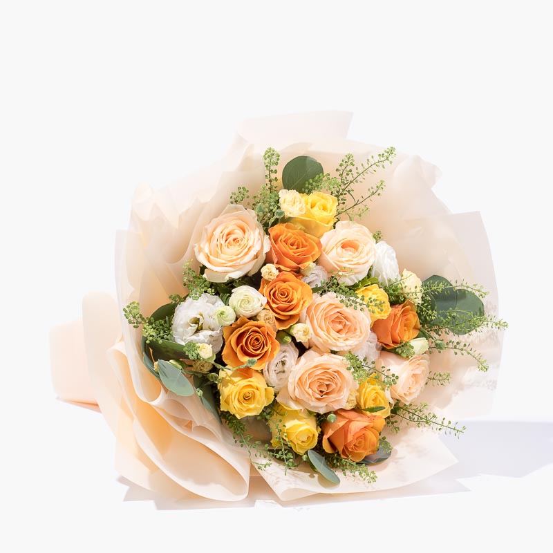 Sunset Orange Rose (5 Stalks), Champagne Rose (5 Stalks), Yellow Rose (5 Stalks), White Eustoma (2 Stalks), Yellow Carnation Spray (3 Stalks), Green Bell
