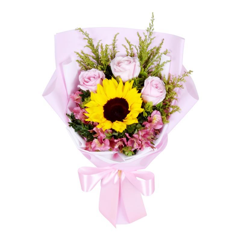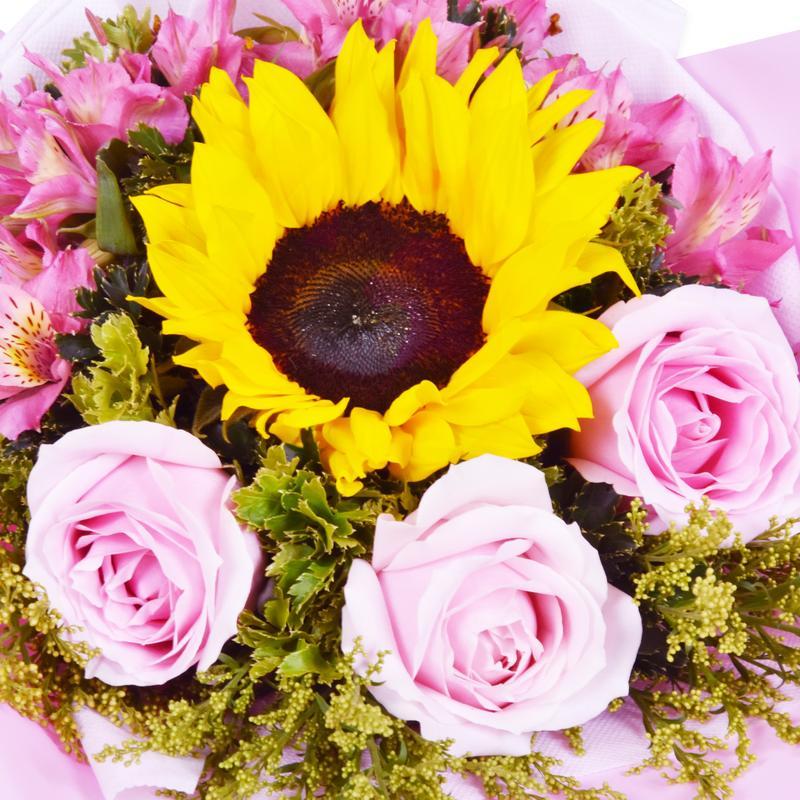 Pink Alstroemeria (3 Stalks), Gold Rod, Light Pink Rose (3 Stalks), Yellow Sunflower (1 Stalk).