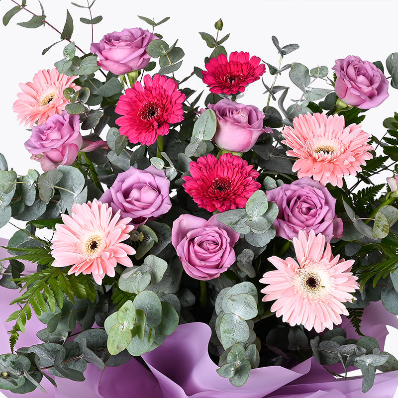 Purple Rose (8 Stalks), Shocking Pink Gerbera (4 Stalks), Light Pink Gerbera (4 Stalks), Eucalyptus Leaves