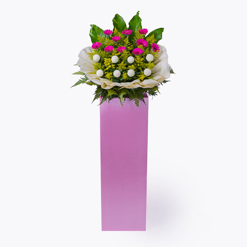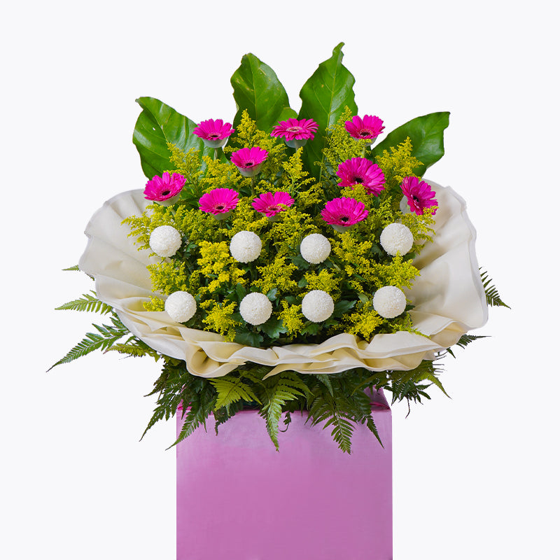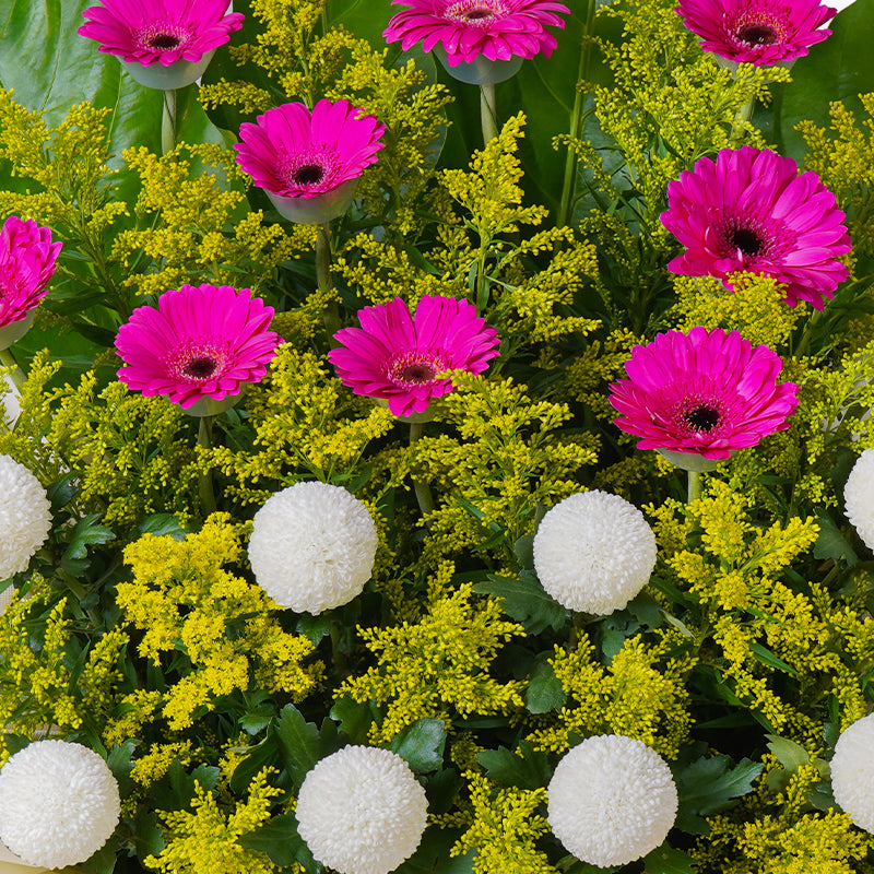 Shocking Pink Gerbera (10 stalks), White Ping Pong (8 stalks), Green Rainforest, Green Paku Leaf, Yellow Peacock