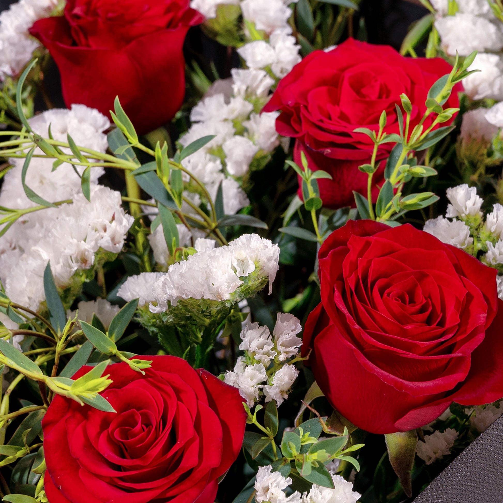 Red Rose (5 Stalks), White Statice (4 Stalks), Parvifolia Eucalyptus (3 Stalks)