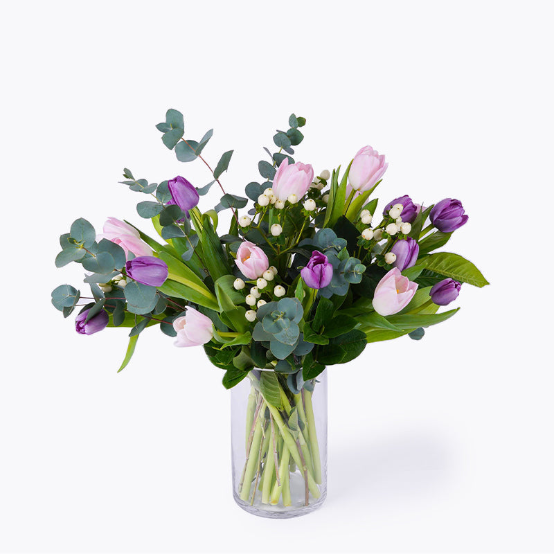 Evoking an aura of sophistication, Purple Rain is a rejuvenating flower arrangement that features tulips in soft pastel shades such as pink and purple. Balanced with fresh eucalyptus greenery, have it complement your living spaces to uplift your spirits.