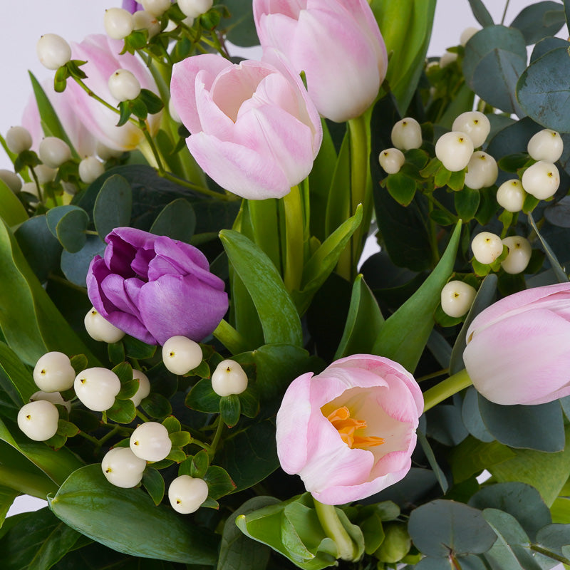White Berry (5 Stalks), Light Pink Tulip (10 Stalks), Light Purple Tulip (10 Stalks),  Eucalyptus Leaves