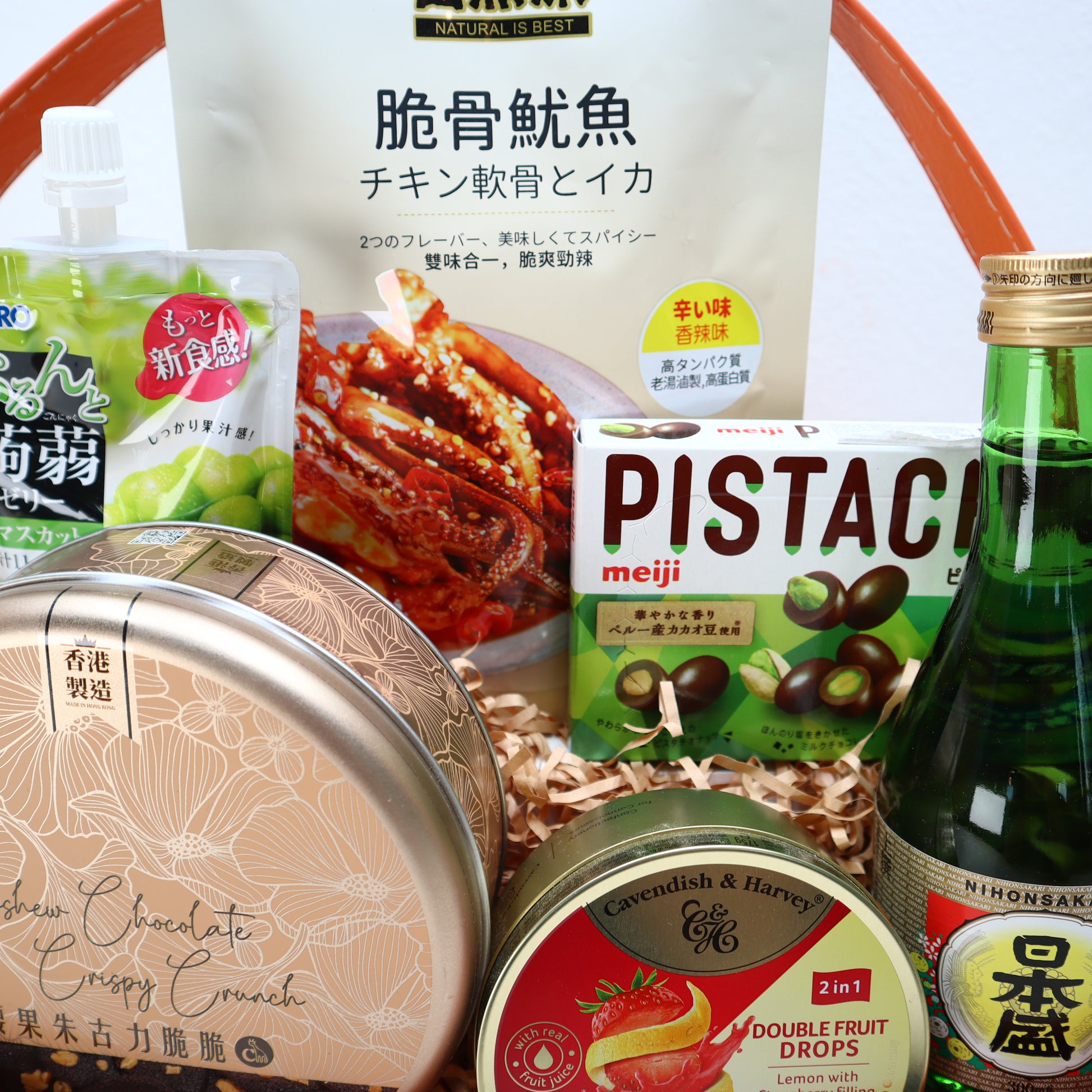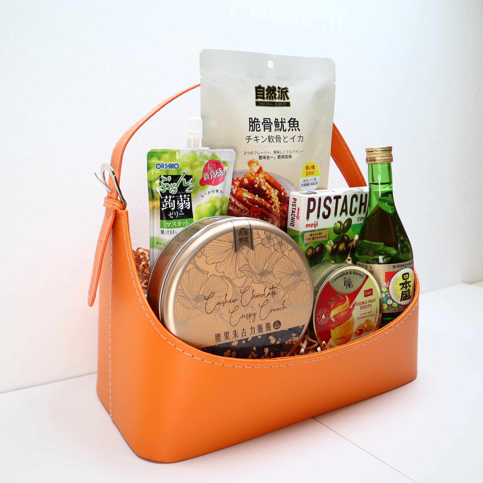 Give the gift of indulgence. Treat your loved one to a hamper filled with delicious treats like Nihonsakari Jousen, CM Bakery Cashew Crunch, Naturalisbest Squid, Orihiro Grape Jelly, Meiji Pistachio Chocolate, and Cavendish Lemon Strawberry Filling.