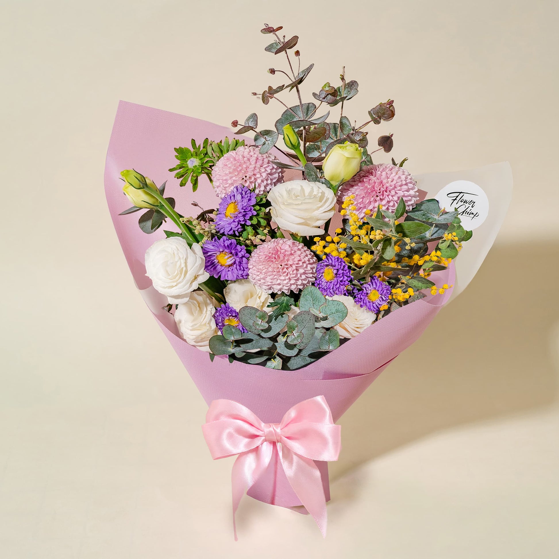 Light Pink Ping Pong (3 Stalks), Purple Asther (1 Stalk), White Eustoma (1 Stalk), Yellow Mimosa (1 Stalk), Cinerea Eucalyptus