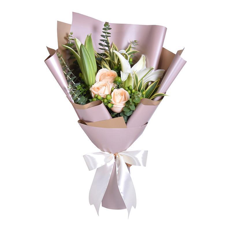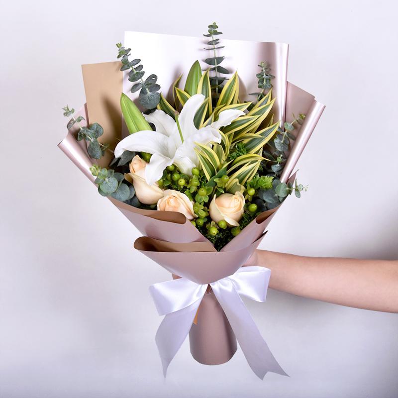 White Lily (1 Stalk), Champagne Rose (3 Stalks), Green Berry (2 Stalks), Eucalyptus Leaves, Green Song of India
