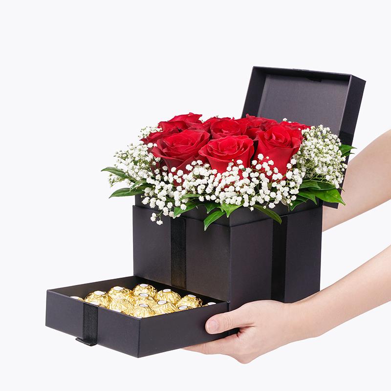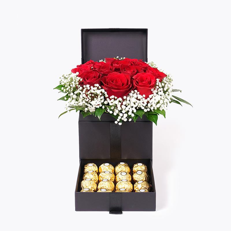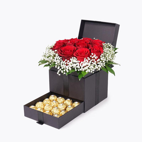 The most elegant gift of love - brimming with gorgeous red roses and decked with the sweetest baby breaths and murrayas. Our splendid Hera Trinity Box is a gift truly fit for the queen of your heart.
