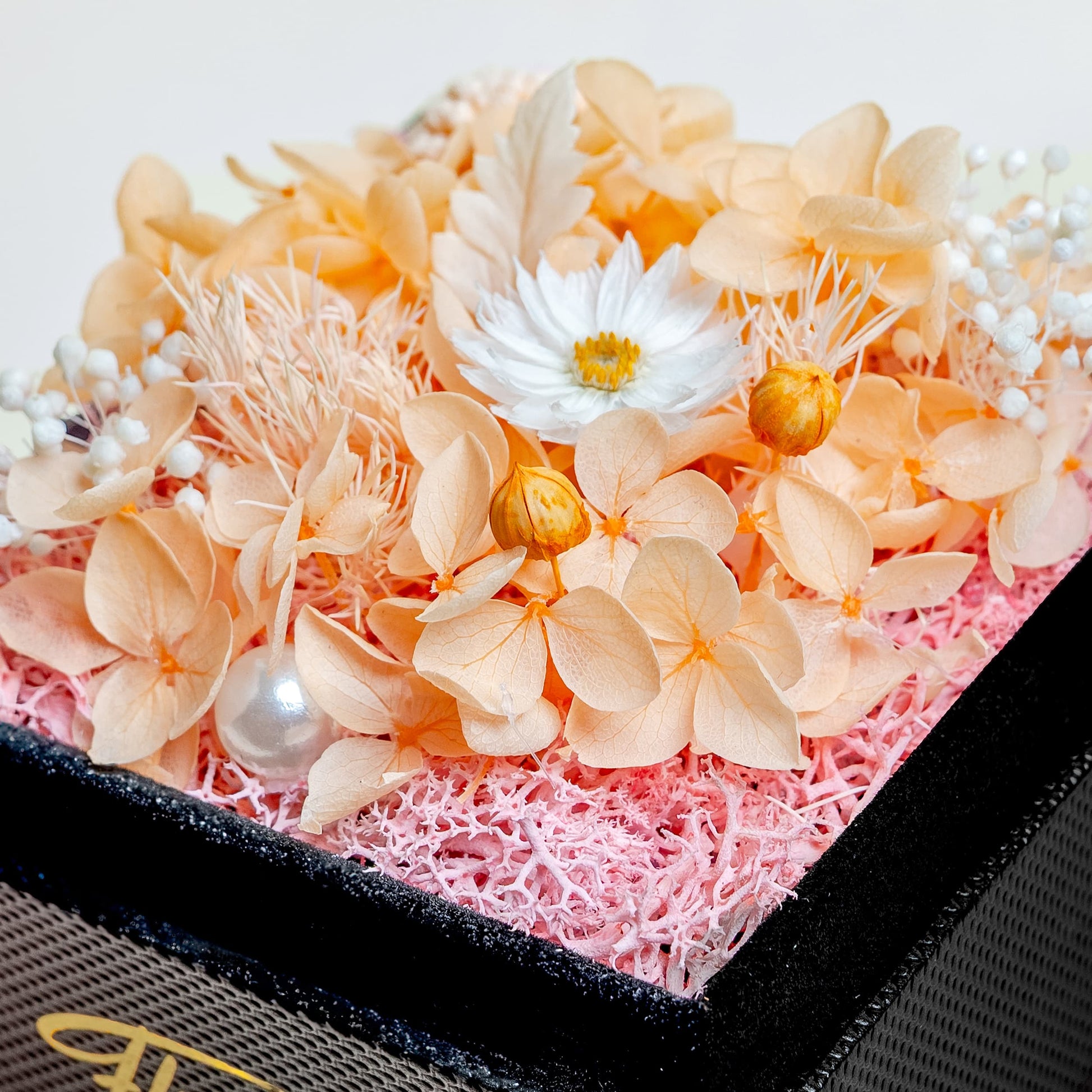 Mixed Preserved Flowers, Champagne Hydrangeas, White Baby Breath, Pink Craspedia, White Rhodanthe, White Fern, Pink Asparagus Fern, Pink Moss, Orange Acacia Bean