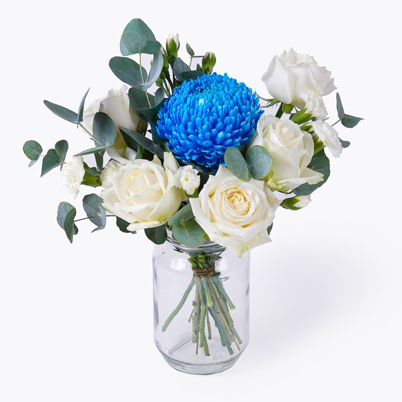 Exhibiting a classy radiance, Iris is suitable for those who prefer an elegant floral arrangement. With the eye-catching blue bud and stems of white roses, it lends a pleasant colour palette that'll refresh your spaces for day