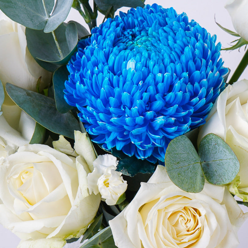 White Rose (5 Stalks), White Carnation Spray (2 Stalks), Blue Mum Net (1 Stalk), Eucalyptus Leaves