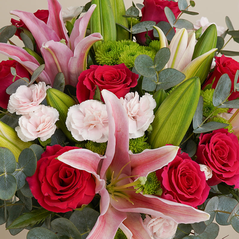 Shocking Pink Rose (8 Stalks), Pink Lily (4 Stalks), Pink Carnation Spray (3 Stalks), Green Button Mum