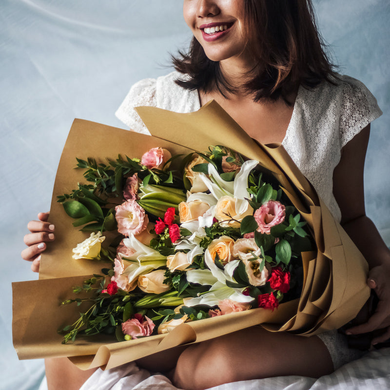 Champagne Roses (10 Stalks), White Lily (5 Stalks), Champagne Eustoma (6 Stalks), Red Carnation Spray (4 Stalks), Eucalyptus Leaves