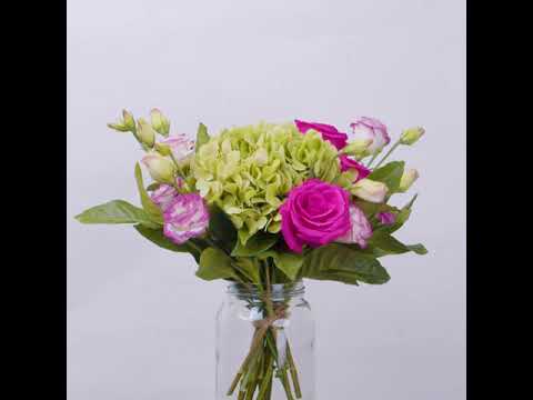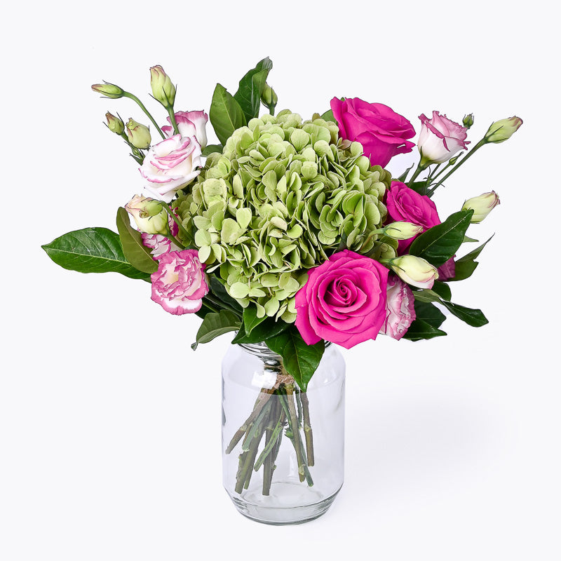 Shocking Pink Rose (3 Stalks), Green Hydrangea (1 Stalk), Pink Eustoma (2 Stalks)